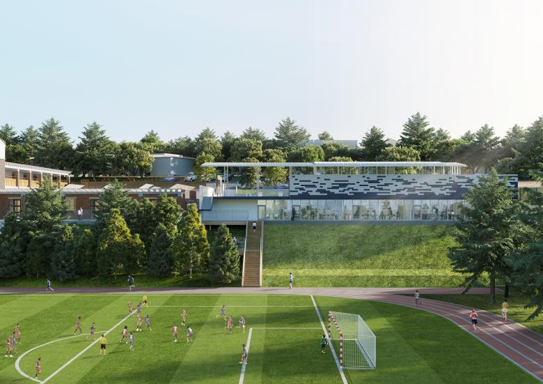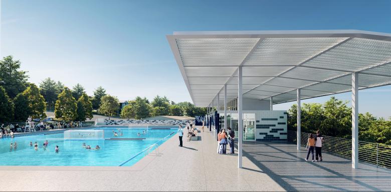 A new replacement High school competition swimming pool located on a hillside. The new complex includes a 75' x 125' pool, locker rooms and offices . Below the pool are additional bathrooms, classrooms, storage, mechanical and multi-purpose spaces.