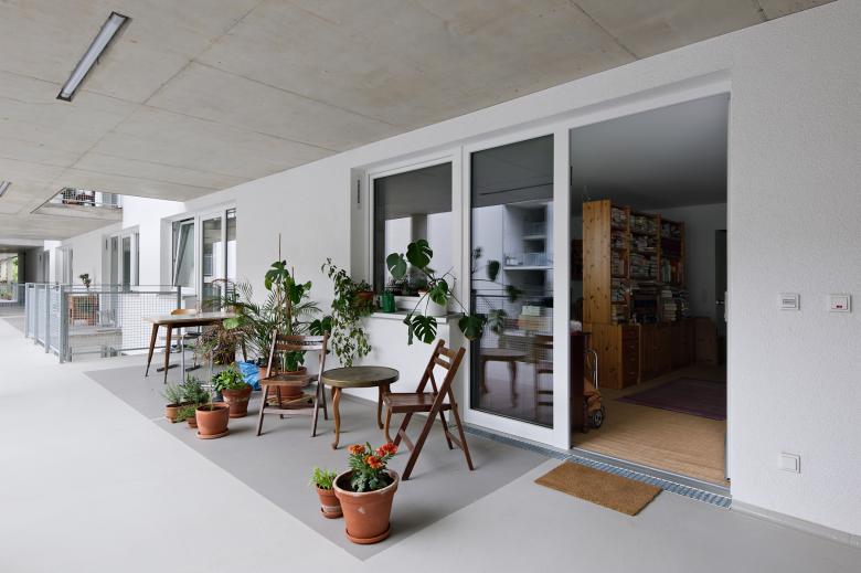 Made up of several constituent parts, this building mediates at the joint between the heterogeneous block perimeter development with its typical fire walls and the large, meandering late modern structures dating from the Sixties and Seventies. The new building increases the density of the site and unites the two different scales and typologies, the slab and the courtyard, which dominate its surroundings. The proposed geometry nestles up against the firewalls of the existing neighbouring buildings and with its central courtyard creates an outdoor space of considerable quality. By making one wing of the new building taller than the buildings immediately beside it, an independent symbol is placed in the district. The functions proposed for the ground floor, such as a café with outdoor seating on Kienitzer Straße and flexibly sized studios along Briesestraße, activate the urban space. Each of the four parts of the building reacts with a simple basic structure and typology to its specific position within the system. The apartments created range in size from 1 to 4 rooms and there are also studio apartments and larger apartments with additional communal areas. Within the flexible ‘shelf’ the apartment mix could be adapted with little effort or expenditure. The generously dimensioned internal courtyard becomes the social centre of the housing development. The access decks facing onto the courtyard are a circulation and balcony structure with the potential to be appropriated by the community of residents. Two passageways on the ground floor lead into the communal courtyard, which thanks to its partly planted, partly hard surfaced terracing makes an urban impression. The appearance of this made-to-measure urban piece in the heterogeneous urban mesh of the Rollberg district results from the use of industrial materials which, through their detailing, the way they are put together and their particular resonance, emanate a high level of quality. Facades with French windows and cladding of large aluminium panels rise from a robust exposed concrete plinth. This materialization provides an unpretentious background for the appropriation of the building by its residents.
