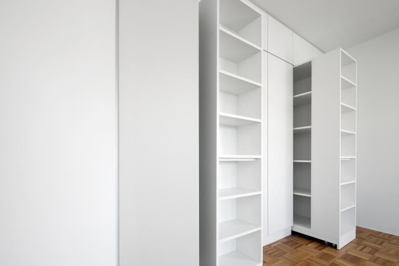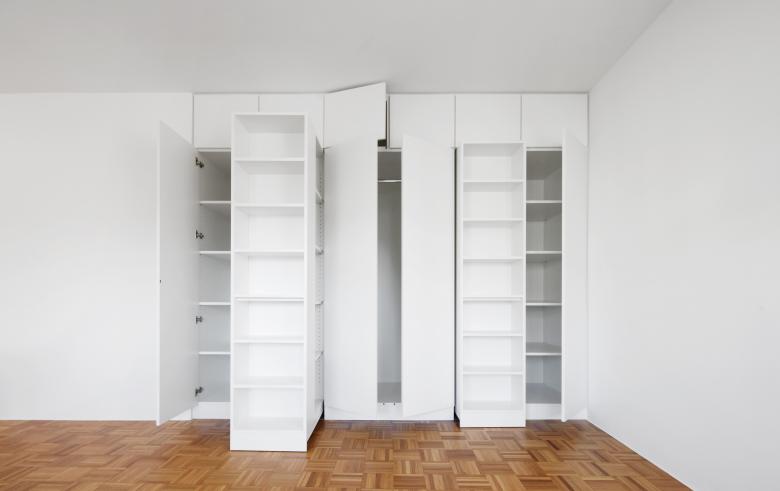 Zwei benachbarte Eigentumswohnungen innerhalb eines End-60er Jahre Mietshauses in der Münchner Isarvorstadt wurden entrümpelt, entkernt, baulich verändert und mit gezielten Einbauten auf das Wesentliche reduziert.
