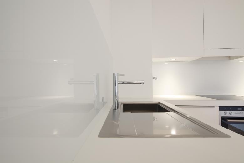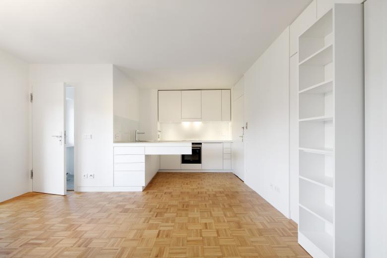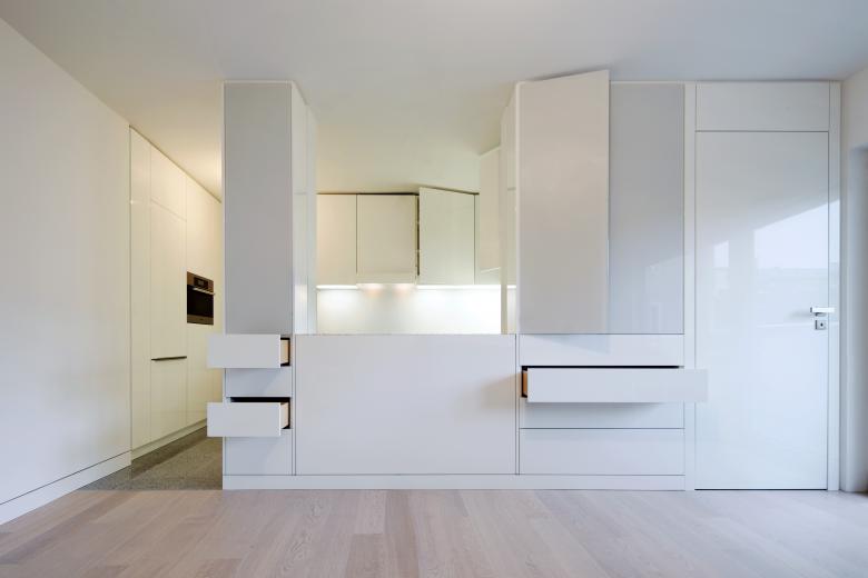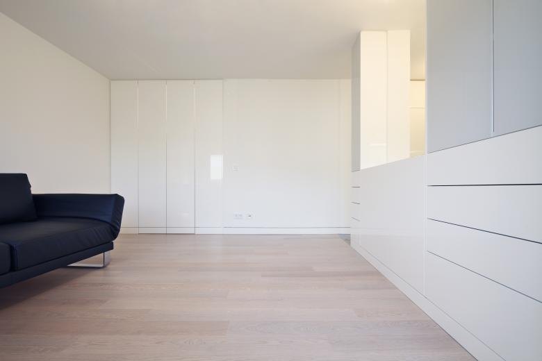 Es entstand je Wohneinheit ein freigestellter Wohnraum. Diesen Wohnraum umrahmend finden sich die baulich integrierten und konzentrierten Funktionszonen. So konnte auf engstem Raum der Leidenschaft des Bauherrn folgend eine Küche mit gehobener Kochkunstausstattung umgesetzt werden. Die ehemals innenliegenden Bäder wurden ans Licht geführt. Wandnischen wurden als begehbare Schrankzonen, den Wandfluchten folgend, abgeschlossen und sorgen angesichts der Wohnungsgröße für beachtlichen Stauraum.