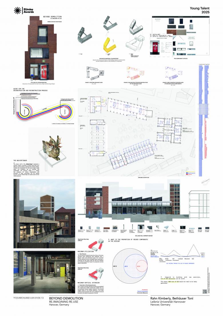Our focus lay on reinforced concrete frame construction, as this type of structure is most frequently demolished in Hanover. By means of preselected criteria, we evaluated component reusability in a prototype: the source object, a 1960s office building. This evaluation resulted in a component reuse rate of approx. 85%, with 5,076 components available for the design.
