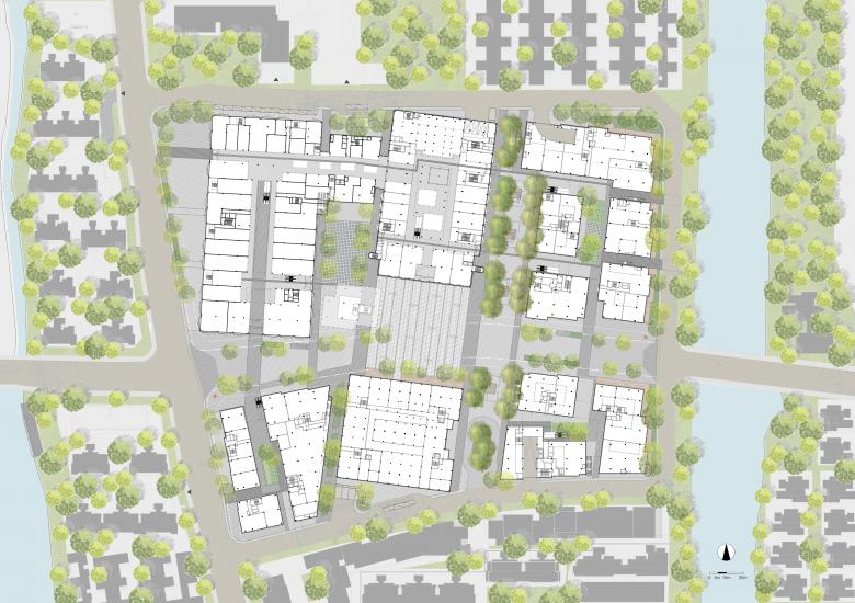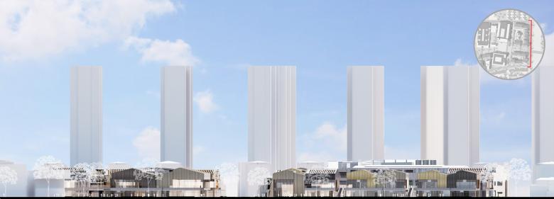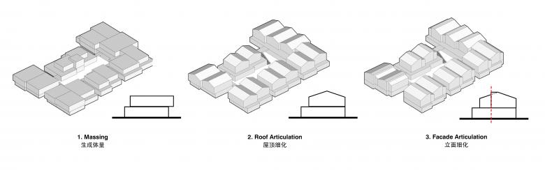 3 additional villages were constructed, weaving and reinforcing the urban fabric. The design draws inspiration from old factories and divides the large volume into an organic composition of smaller “factory-like” structures. It avoids a singular and monotonous sloped roof, instead employing a method of offsetting to create variations in height. This approach preserves the traditional architectural language while giving the facades a more modern and dynamic appearance.