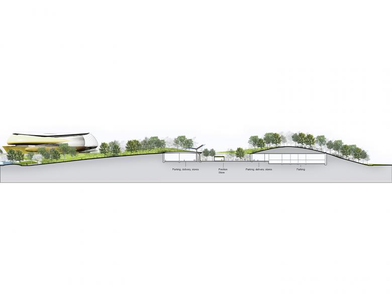 Size: 46.7 hectare park, 35,000 m2 Table Tennis stadium (5000 seats), 15,000 m2 Field Hockey stadium (5000 seats), 29,000 m2 commercial mall, 23,00 m2 fitness center, and 68,000 m2 underground parking, all with green roofs and natural ventilation