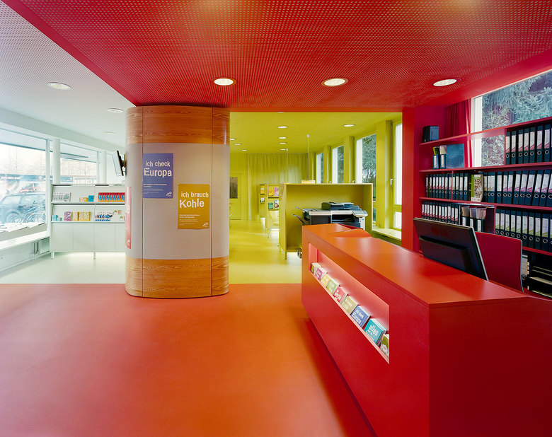 Drei räumliche Farbschleifen, die in einander verwoben sind, verleihen dem Raum eine positive, visuelle Grundstimmung und einen sanft stimulierenden farbigen Hintergrundklang. Es entstehen mehrere Raumbereiche mit unterschiedlichen Ausdrucksmöglichkeiten. Ein eisblauer und frischer Bereich am Fenster zur Straße, ein gelbgrüner, konzentrierter Bereich zur Gartenseite, der bis in den Beratungsbereich führt. Auf der orangeroten Schleife liegen Eingang und Theke als erste Anlaufstellen und aktive Informationspunkte. Der farbige Hintergrundklang schafft für die Vielfalt an Informationsmaterial einen kräftigen, aber ruhigen Hintergrund. Die Assoziation der Einzelmöbel mit Mobilitäts-Motiven schafft eine räumliche Dramaturgie von Aufbruch und Veränderung.