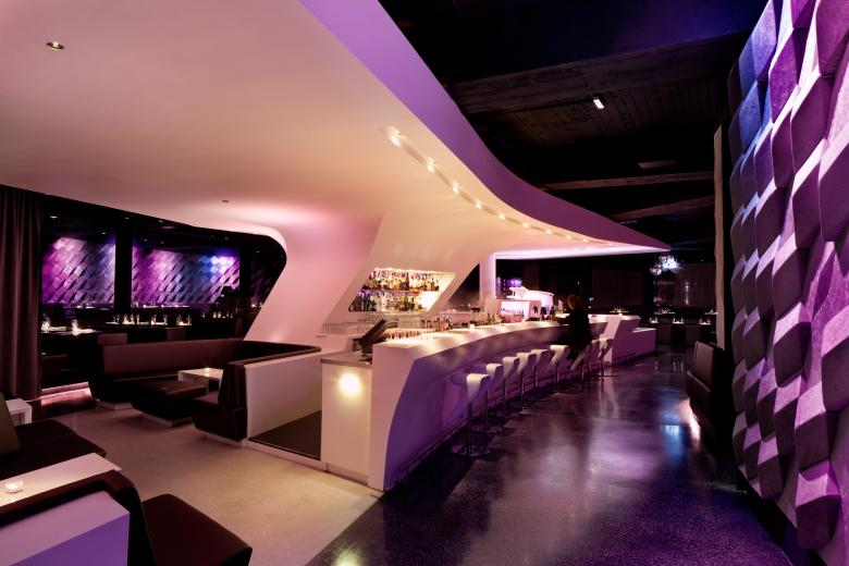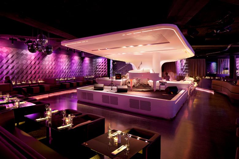Das Kernstück unseres Design bildet eine weiße Skulptur, die die Hauptfunktionen wie die Bühne für Livemusik, das DJ-Pult, zwei Bars und eine Lounge beinhaltet. Der Essbereich ist rund um dieses Zentrum arrangiert. Um eine perfekte Sicht auf die Bühne zu gewährleisten, wurden die Esstische auf drei verschiedenen Stufen platziert. Der Tanzbereich wurde vor der Bühne angelegt und ist damit ein weiterer Hingucker für die Gäste. Durch diese Positionierung mit der Bühne und dem Dancefloor in der Mitte wird für den Essbereich eine ganz besondere Intimität geschaffen, ohne dass er ausgeschlossen wird.