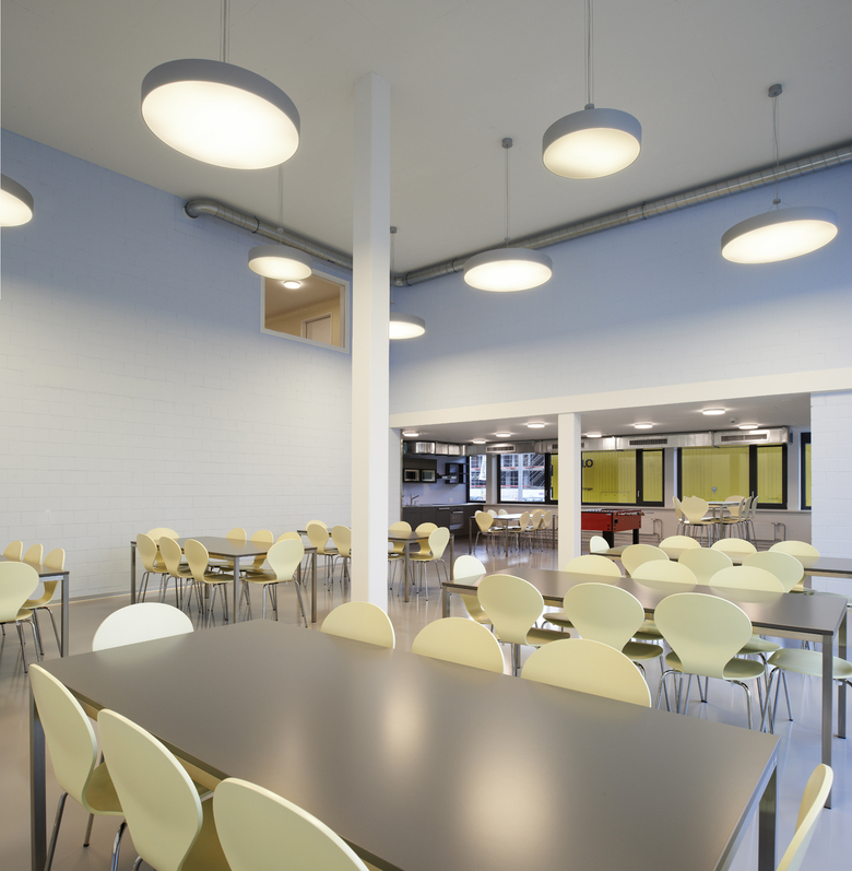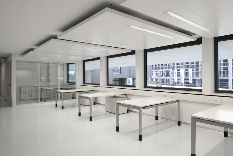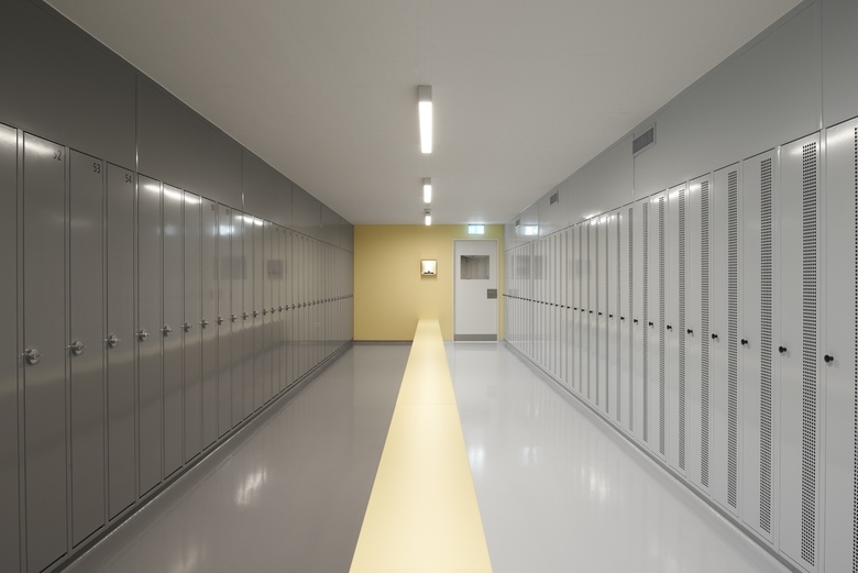 Das weit auskragende Produktionsgeschoss beinhaltet die Erweiterung der bestehenden Produktionsflächen. In den darunterliegenden beiden Geschossen sind die als Personenschleusen konzipierten Garderoben mit Nasszellen für Damen und Herren, verschiedene Büros sowie ein doppelgeschossiger Pausenraum untergebracht. Im Untergeschoss befinden sich Lagerräume.