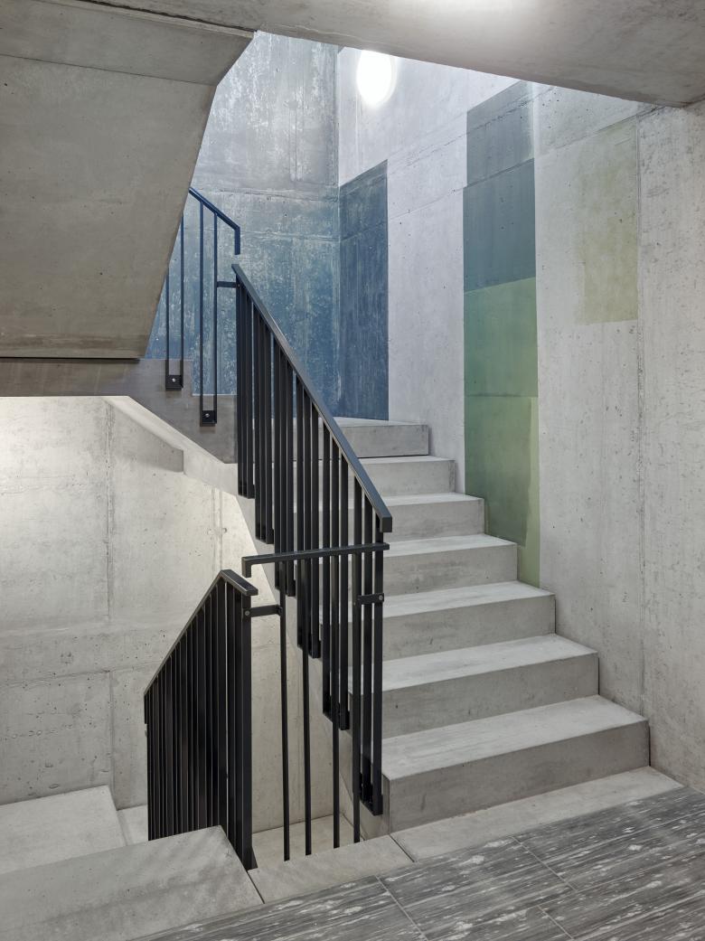 Den benachbarten Häusern entsprechend liegt der Hauseingang im Hochparterre an der nördlichen Seitenfassade. Über eine Eingangshalle und ein innen liegendes Treppenhaus werden pro Geschoss zwei grosse Wohnungen erschlossen. Die Grundrisse der Wohnungen orientieren sich ebenso an den gekammerten Raumabfolgen des 19. Jahrhunderts wie an Elementen moderner Wohnformen.