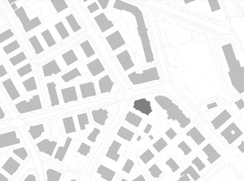 Das neue Haus setzt sich mit diesem reichhaltigen architektonischen Erbe auseinander. Basierend auf dem ursprünglichen Bebauungsplan aus dem 19. Jahrhundert besetzt es den Baulinien folgend markant die Strassenkreuzung. Durch die plastisch-expressiv gegliederte Fassade mit einer ausgeprägten Vertikalen und einer volumetrischen Betonung an der Kreuzung werden architektonische Elemente der umliegenden Häuser aufgenommen. Das Haus, mit seinem betonten Dachabschluss, wirkt turmartig und nimmt Bezug auf das architektonische Repertoire des Kontexts. Die Seitenfassaden und die Gartenfassade sind deutlich einfacher formuliert.