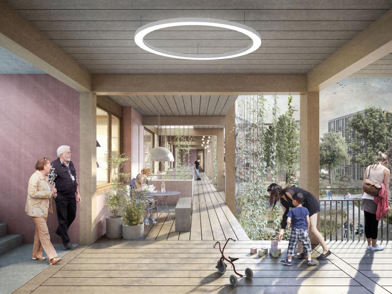 Das städtebauliche Gesamtkonzept schafft ein identitätsstiftendes Baumuster, das sich mit dem Kontext vernetzt und Bezüge zum Stadt- und Landschaftsraum herstellt. Mit einer repetitiven Grundstruktur in Holzbauweise werden differenzierte Gebäudecluster gebildet, die eine gute Körnigkeit, hohe Durchlässigkeit und eine integrative Silhouette gewährleisten. Dadurch entstehen räumliche Schwerpunkte und grosszügige «Leerstellen», die als Abfolge von vernetzten Freiräumen erlebbar sind. Einige werden durch Gewerberäume, Kindergarten, Kita, Gemeinschaftsräume und Co-Working aktiviert, während andere zum Spielen, Gärtnern oder als kontemplative Rückzugsorte dienen.