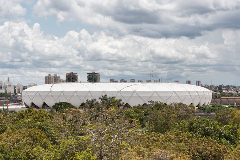 Die Dachkonstruktion setzt sich aus sich gegenseitig aussteifenden Kragarmen zusammen, deren Stahlhohlkastenträger gleichzeitig als große Rinnen dienen, um die enormen Wassermassen der tropischen Niederschläge aufzunehmen. Angesichts des heißen und feuchten Klimas am Amazonas geht das Dach in eine Fassade über, die auch die Zuschauerumgänge und Vertikalerschließungen verschattet. Dach- und Fassadenfelder bestehen aus transluzentem Glasfasergewebe. Die im Zusammenspiel mit den Fassadenöffnungen entstehende natürliche Ventilation fördert ein angenehmes Mikroklima.