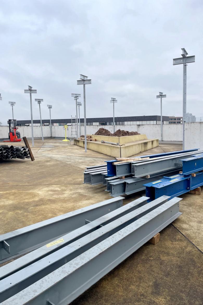 Die Terrassen des gestuften Baukörpers sind im Konzept als Pausen -und Nutzräume für den Unterricht geplant und werden auch so genutzt. Um vor allem in den oberen Geschossen die Nutzungsoptionen aufgrund des Wärmeeintrages zu vergrößern, wurde von Seiten Nutzer:innen ein Projekt zur Beschattung dieser Terrassen angestoßen. Über differenzierte Studien zeigte sich der Vorteil von lamellenartigen, luftdurchspülten und schattenspendenden Elementen, die im Sinne eines klaren Statements durch die Architekt:innen als Re-Use-Elemente definiert wurden. So entsteht eine räumlich präzise Setzung der Schattendächer auf verschiedenen Ebenen auf das mehrfach preisgekrönte Projekt. Gleichzeitig werden zusätzliche Spielangebote geschaffen, die sich unter den neuen Schattendächer entspannt entwickeln können.