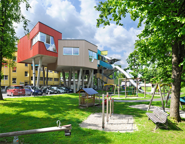 Den Projektbeteiligten war es wichtig, die Wahl der Materialien auf die Grundidee hin abzustimmen. So wurde darauf Wert gelegt, heimische Hölzer und Sägewerkprodukte zu verarbeiten, und die Fassade nachhaltig mit einer sägerauhen Holzfassade in den Grundfarben Skandinaviens zu gestalten. Die konsequente Verfolgung der Grundidee führt letztendlich zu einem natürlichen, abenteuerlichen Ort für Kinder.
