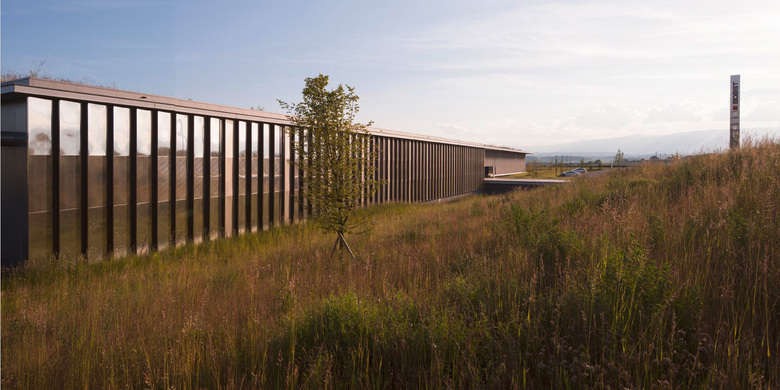 Le rapport au paysage, qui est un des thèmes principaux du projet avec celui du traitement de la lumière naturelle, s’exprime aussi dans le choix des matériaux. Le revêtement des façades de la halle d’exposition, en plaques d’acier inox réfléchissant, évoque un des matériaux composant les machines produites par l’entreprise, à la fois qu’il renvoie à son environnement champêtre et industriel dont il réfléchit l’image.