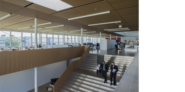 La figure horizontale du bâtiment, renforcée par la ligne de l’avant toit, se projette sur le paysage, contrastant avec les ondulations naturelles du terrain. Cette horizontalité est accentuée par l’axe de la « Promenade des Alpes » aménagée par l’Atelier du Paysage, composée d’un bassin en pierre naturelle qui longe la promenade, et qui se prolonge par une généreuse rampe conduisant à l’entrée principale. Cette promenade joue le rôle de véritable colonne vertébrale paysagère structurant l’ensemble du site.