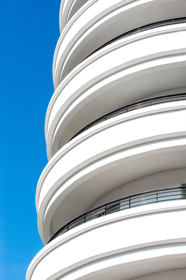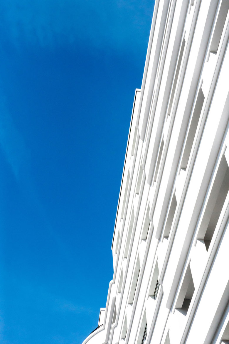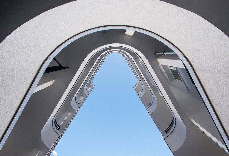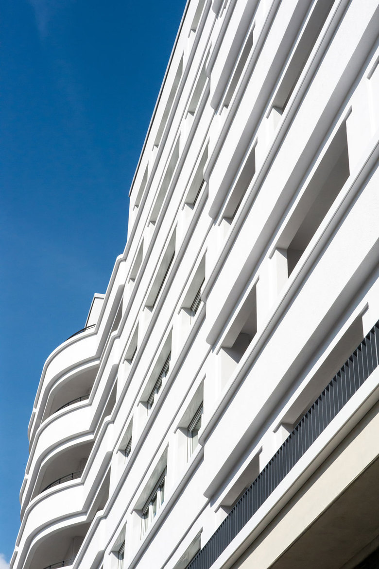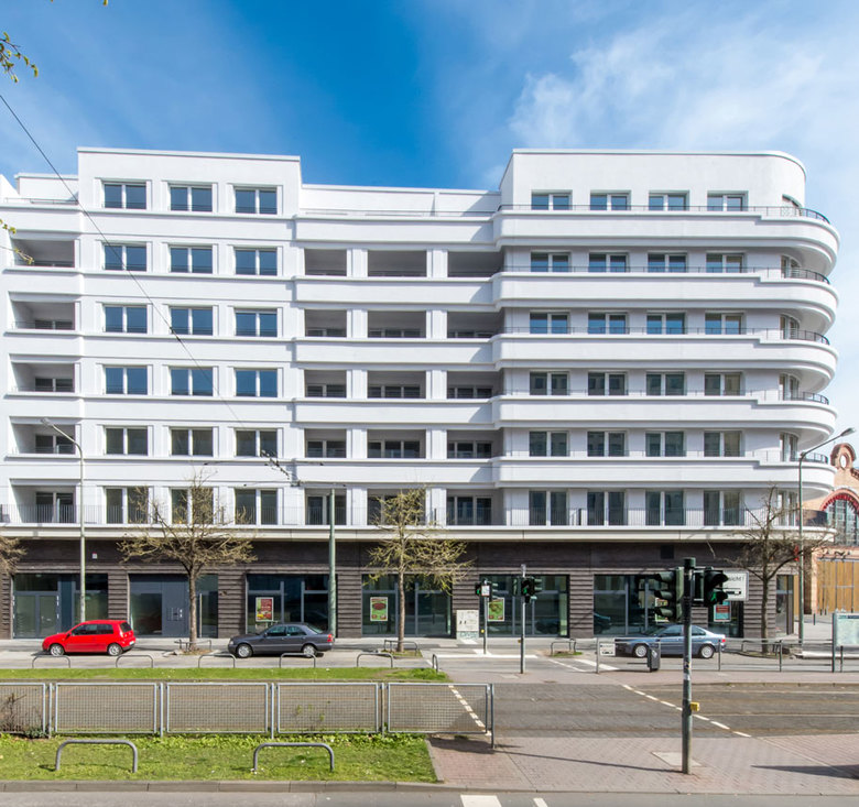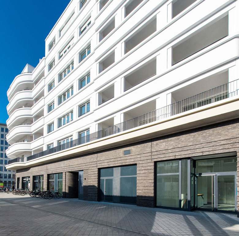 Als Auftakt zur Neubebauung des ehemaligen Campus Bockenheim der Goethe-Universität wurde an der nördlichen Spitze des Areals eine Blockrandbebauung mit drei übereck geführten Wohnhäusern von unterschiedlichen Architekturbüros realisiert. In diesem Kontext entwickelten STEFAN FORSTER ARCHITEKTEN ein Wohnhaus mit 58 Wohnungen und einer Einzelhandelsfläche in prominenter Lage direkt neben dem denkmalgeschützten Bockenheimer Depot am Carlo-Schmid-Platz. Zum Platz hin öffnet sich das Gebäude mit großzügigen Balkonen, die das Motiv der abgerundeten Ecke aufnehmen. Gesimse und verschieden tiefe Verputzsprünge erzeugen die gewünschte Plastizität und stellen den Bezug zu großstädtischen Wohnhausarchitekturen des vergangenen Jahrhunderts her. Der dunkle Klinkersockel bezieht sich in seiner Materialität auf das Bockenheimer Depot, der gewählte Farbton hält jedoch bewusst Distanz. Die Wohnungen verfügen jeweils über Loggien bzw. Balkone zur Vorder- und Rückseite. Das Gebäude wurde im Passivhausstandard errichtet.