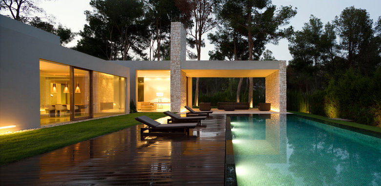 El objetivo del proyecto de Ramon Esteve ha sido la creación de diferentes áreas exteriores vinculadas a las estancias interiores, según el grado de intimidad de cada una de ellas. Cada pieza tiene una altura en función de su uso desarrollándose en una planta, excepto el volumen de los dormitorios. Con este gesto se obtiene una planta en forma de cruz que organiza el espacio exterior. Partiendo de cuatro muros de piedra, se generan unos volúmenes prismáticos que fragmentan el espacio, individualizando cada estancia.