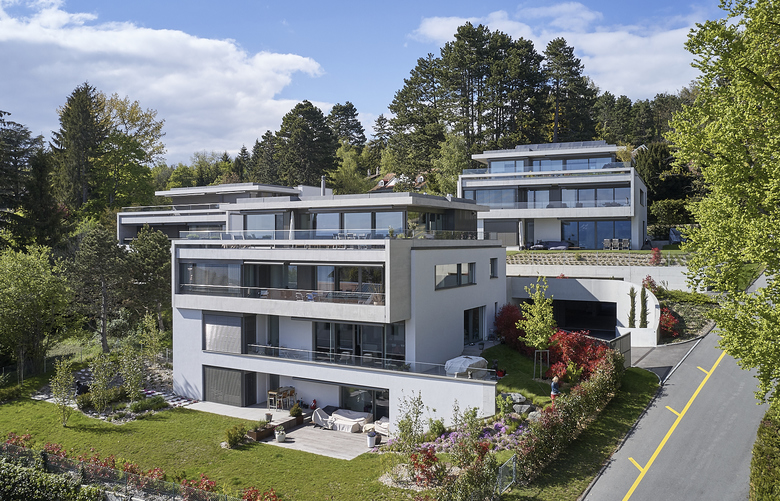 Cet ensemble, localisé en zone villa à Pully, se compose de trois villas urbaines comprenant chacune trois appartements, un par étage. Les appartements type de 184 m2 comptent 5½ pièces dans la solution de base, avec 4 chambres dont un bureau pouvant être relié au salon. Les surfaces extérieures varient de 25 m2 pour les loggias des étages, à 70 m2 pour les terrasses du rez-de-chaussée – sans compter le jardin qui les entoure. Pour les appartements d’attique, le programme de base propose un 3½ pièces de 104 m2, avec deux chambres en suite et un espace jour ouvert sur une terrasse de 100 m2. Grâce au plan rayonnant, tous les espaces s’ouvrent discrètement sur le contexte et clairement sur le grand paysage et le Lac. Les trois bâtiments sont reliés en sous-sol par un parking de 18 places qui, avec sa spatialité généreuse mise en valeur par l’apport de lumière naturelle, contribue à la qualité de l’ensemble. L’espace de transition entre le parking et les appartements intègre le programme des caves et des locaux techniques.