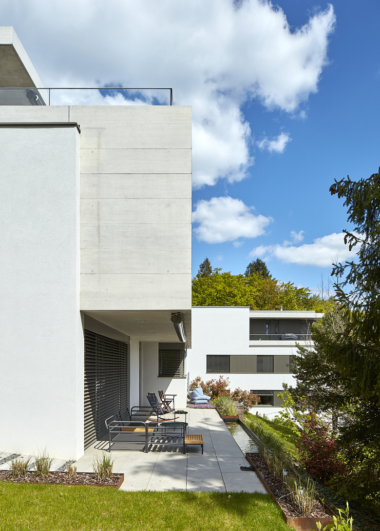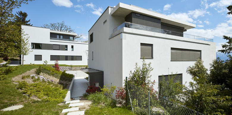 Intégrer harmonieusement trois bâtiments dans un contexte de villas, dans un terrain en pente, tout en préservant un grand chêne, tels ont été les principaux défis de ce projet. Dans un souci d’unité et de simplicité, une logique de répétition a été mise en œuvre. Ainsi, le fait de placer les trois volumes en quinconce, et de les poser de manière naturelle sur le terrain, a permis d’offrir à chaque bâtiment une situation particulière, afin de profiter au mieux de la vue et d’une relation au contexte immédiat, comme c’est le cas pour le bâtiment placé sur le haut de la parcelle, qui bénéficie d’un rapport privilégié avec le chêne centenaire. Chaque étage s’ouvre sur trois côtés. Le front sud offre une vue splendide sur le paysage, et l’implantation en quinconce permet d’éviter des vis-à-vis entre les façades latérales. Le contexte, semblable à celui d’une zone résidentielle malgré la présence de quelques immeubles, a conduit à la stratégie de donner à chaque bâtiment l’expression d’une grande villa plutôt que celle d’un immeuble de logements. C’est dans ce but que chaque étage développe son expression propre : le rez-de-chaussée avec ses terrasses, l’étage avec la loggia, et l’attique qui s’affiche comme une villa sur le toit.