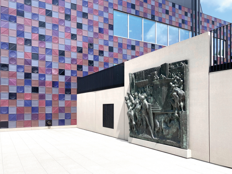 Ein besonderes Highlight ist dabei die Fassade. Die 50 x 50 cm großen Fassadenkacheln mit den fünf Farben und den kombinierten Motiven »Kreis« und »Dreieck« werden aus dem Bestand heraus gesichert und um Kacheln mit zwei Farben mit dem Motiv »Quadrat« ergänzt. Die neue Komposition erzeugt ein differenziertes Erscheinungsbild mit Flächenwirkung von Weitem und heterogenem Farbspiel aus der Nähe. Das Bestandsgebäude, das sich bisher im Volksmund mit den Spitznamen »Kachelofen« oder »Schwimmbad« zierte, erfährt so eine interessante Neuinterpretation.
