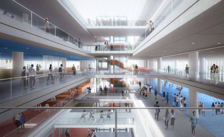 活力连桥是由一系列桥梁组成,直接连接四栋建筑的多层结构。设计总面积4.8万平方米。北部的两座建筑用于办公和零售,南部的两座建筑则定位于体育设施和零售业。这些桥梁连接了各种功能,为公共领域创造了一个多层次的街景。公共广场和观景平台可调节体积功能块之间的高度差。这些桥梁的战略位置,形成一个明确的视觉和物理联系之间的运动厅和其他功能。中轴是一个充满活力与热情的空间,旨在连接行人和向游客发出邀请。