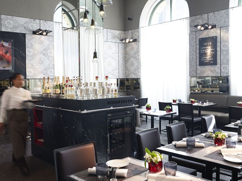 Der Blickfang des vorgelagerten niedrigeren Weinraums ist die raumhohe Weinwand die sich über die gesamte Länge des Raums erstreckt. Durch die offenen Weinstellagen und die farbig- getönte Glaswand wird ein Sichtbezug zum Eingangsbereich des Hotels geschaffen. Die Atmosphäre einer traditionellen Brasserie in den Kontext der heutigen Zeit zu setzten war eine große Herausforderung. Klassische Brasserie Materialien und Elemente wie Naturstein, Zementfliesen und Spiegel wurden formal modern umgesetzt und ungewöhnlich kombiniert. Luxuriöse Oberflächen werden neben Vintage-Oberflächen gesetzt und erzeugen so eine gewollte Nonchalance.