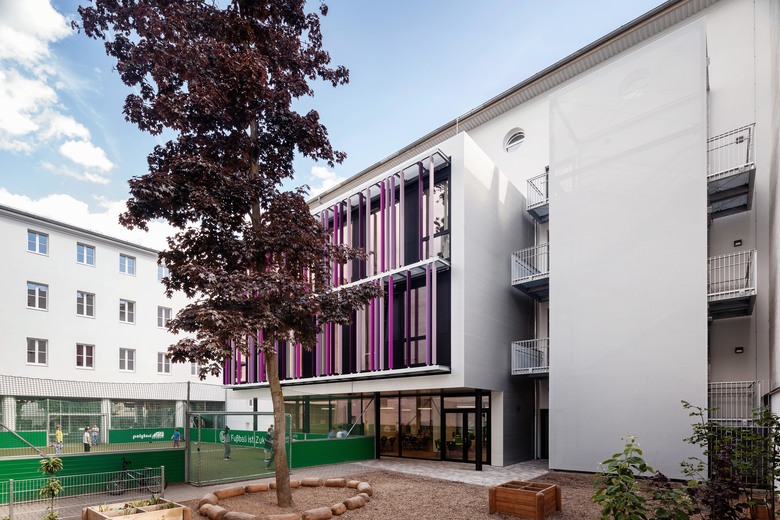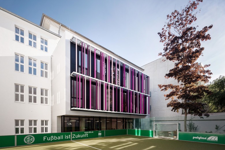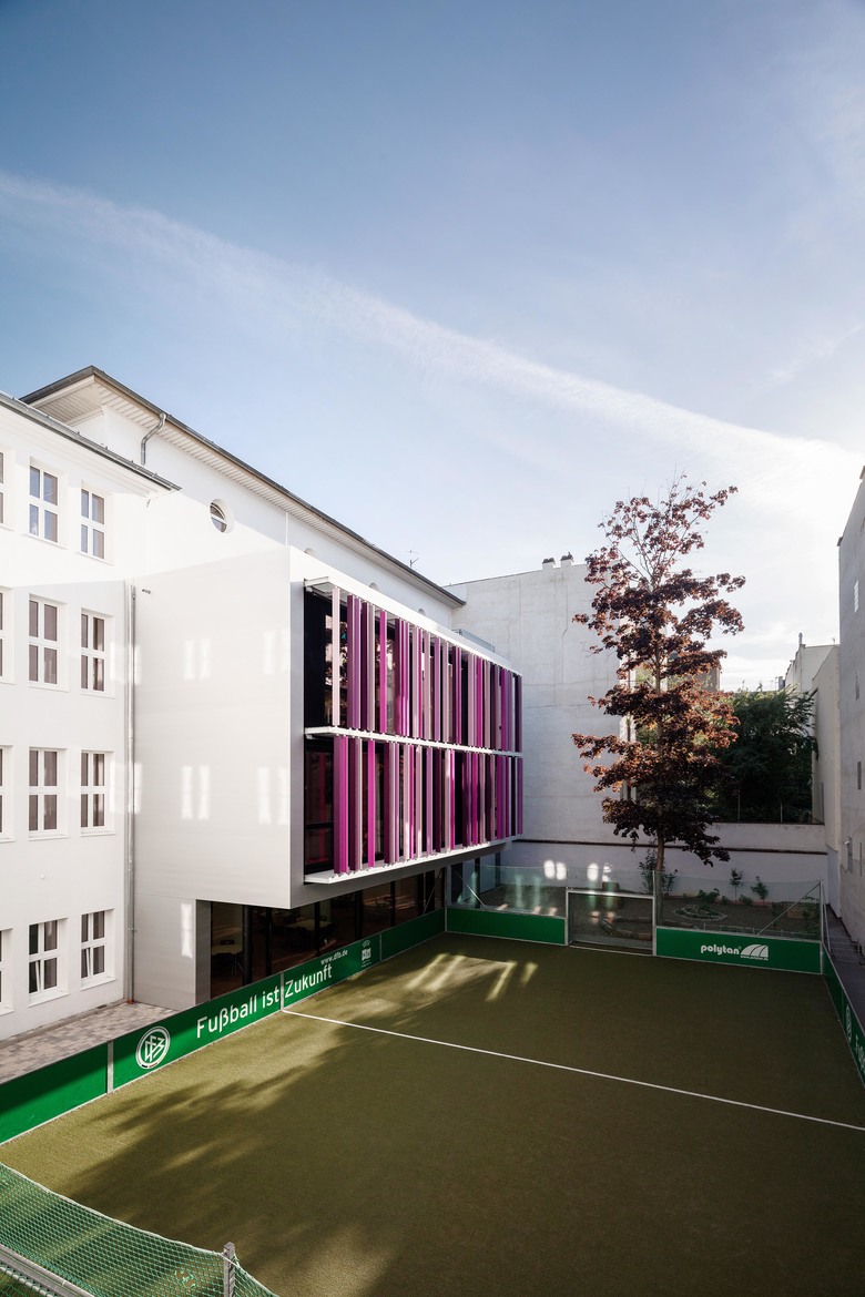 Zusätzliche Klassen- und Betreuungsräume wurden als bauliche Ergänzung vor die Obergeschossfassade in den Pausenhof gestellt. Über der Mensa lehnt wie ein Raumregal ein Anbau aus Stahl an der Innenhoffassade des Schulgebäudes. Der Rücksprung im Erdgeschoss hält die Hoffläche weitestgehend frei von Bebauung und somit auch das im Innenhof gelegene DFB-Minispielfeld, das bei Schülerinnen und Schülern für kurze Weile in den Pausen und nach Schulschluss sorgt. In den beiden Obergeschossen ist die vorgelagerte vertikale Fassadenstruktur Sicht und Sonnenschutz. Außerdem bringt sie zusätzlich Farbe in den Schulalltag.