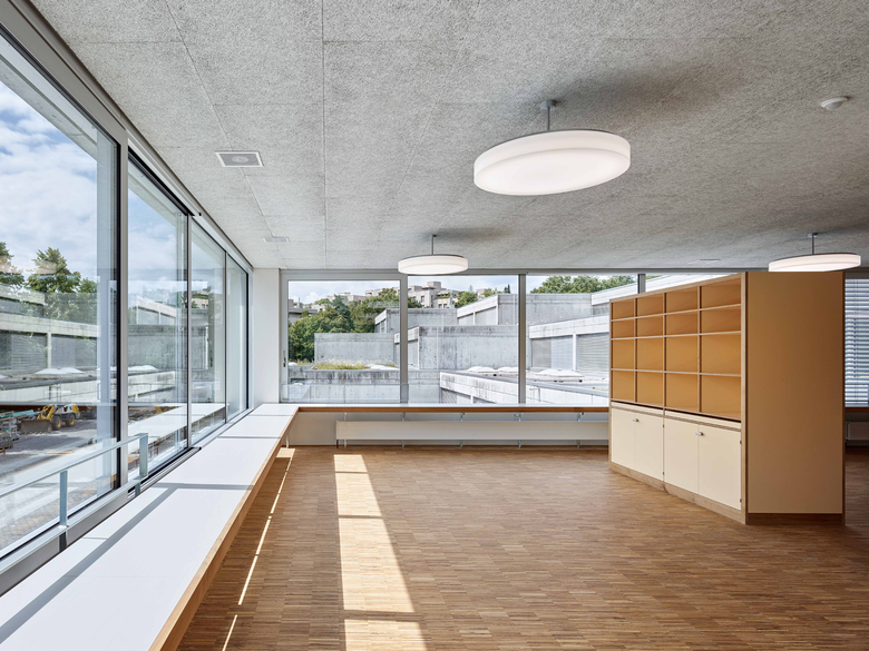 Der Entwurf greift die fast quadratischen Klassenräume, die großflächigen Fensteranordnungen mit Oberlichtern und die daraus resultierenden hohen Innenraumqualitäten auf. Durch die Erweiterung und geschickte innere Organisation sowie auf Grund der sanften Verdichtung im bestehenden Raumvolumen entwickelten sich neun zusätzliche Klassenzimmer, fünf Gruppenräume und die Tagesschule. Die eher kühle Stimmung des Bestandes mit Sichtbetonwänden und Waschbetonböden wird mit integralen Massnahmen aufgewertet und zu einem neuen Ganzen zusammengefügt. So werden mit Holz bei Schränken und Absturzsicherungen stärkere Akzente gesetzt, eine weichere und gleichzeitig effizientere Beleuchtung schafft eine angenehme Atmosphäre und das sich im Anbau verdichtende Farbkonzept strahlt Freundlichkeit und Wärme aus.
