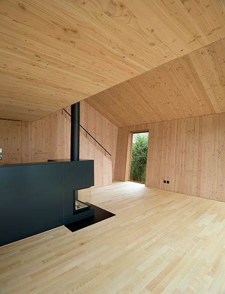 Das dunkel lasierte Holz lässt die Bauten kompakt erscheinen und intergriert sie in die baumbestandene Parzelle. Zusammen mit den naturbehandelten Fenstern entsteht eine stimmige Materialisierung.
