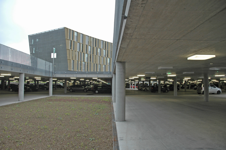 Dietmar Feichtinger Architectes rigorously cleared the entire competition site of motor vehicles. The metal desert that even for the Voest − which is generally most interested in the use of its own products – no longer seemed to have any advertising appeal is now one level lower and has become a “parkgarage” (the German term for car-parking garage) in the double sense of this term. Built of reinforced concrete of remarkable quality, flanked on the open edges by planted embankments, naturally cross-ventilated, lit from planted atriums and broken up into almost domestic proportions by glass walls, some transparent, some satin finish, this garage with its light- coloured polished floor continues the business of representation begun above ground level in a highly skilled way. Whoever does not exploit the privilege of driving under the new steel and glass canopy (also designed by Dietmar Feichtinger Architectes) that projects far in front of the BG41 building and instead, when the weather is inclement, wishes to stay dry by walking through the garage, will not be disappointed by the underground setting.
