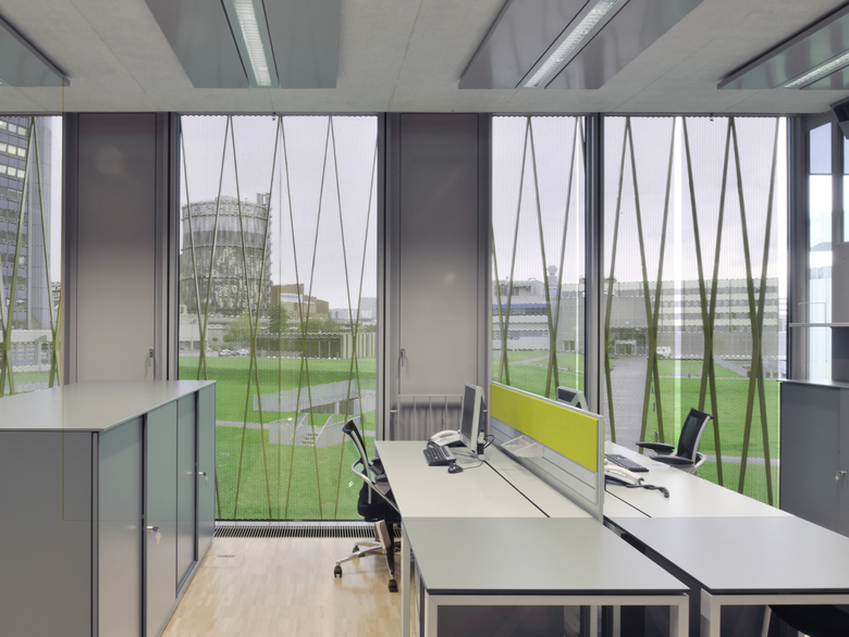 Golden façade, green atria – The offices proper are on the four upper floors that are encased in a shimmering golden façade. They are laid out in a strictly linear, double-loaded fashion, but the curve of the building visually reduces the apparent length. The offices lie along a wide centre zone in which four glass roofed atria are incised. Beside each atrium there is a circulation and services core of exposed concrete, between them are the “living rooms” of the departments. The offices are separated from these communication areas by glass walls, satin-finished in places, which for the staff required some getting used to, as did the restrained colour scheme of the interior: gentle shades of grey are complemented by the light brown of the wooden floors and by strong signal-like colours in the area of the tea kitchens. The relatively narrow subdivision of the façade into full-height opening steel panels and fixed glass elements, also full-height, allows different size offices to be made in accordance with the different requirements. Sliding shade elements of frameless expanded metal on the outside face of the facade and the textile glare protection on the inside ensure agreeable lighting conditions. Dietmar Feichtinger Architectes display the steel construction – columns and open web beams, as well as the concrete of the ceiling slabs. The building services which run only above the corridors can be made out behind their expanded metal cladding. The discipline that this demanded in both design and execution adds a further level of quiet elegance to the overall impression, something that, unfortunately, one can often look for in vain in many a palatial office block.