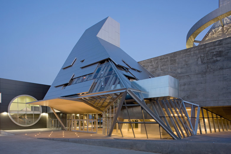 Like chess figures three sculptural buildings dominate the campus of the High School #9: a tower as sign for the arts, a public lobby, and the library in the center. All three buildings can be seen from the main school entrance via a 24 m wide grand stair. The central location of the site downtown, separated from the Grand Avenue corridor by the 101 freeway and thus visually exposed along the edge of one of the most widely used thoroughfares in downtown Los Angeles, served Coop Himmelb(l)au as the point of departure for the architectural concept for the school. To provide public spaces within a high school through the architecture and supported by the performing arts program is one of the main contributions of this project to education and the community, and unique in contemporary public school buildings in Los Angeles. The facilities for the four academies for Visual Arts, Performing Arts, Music and Dance are used by about 1,800 students and include classrooms, studios and administrative spaces. Shared spaces are grouped around the main school courtyard: the library, a public 950 seat performing arts theater, a cafeteria, administrations spaces, science rooms, and open air facilities.