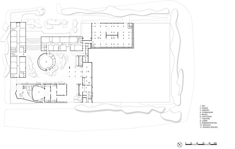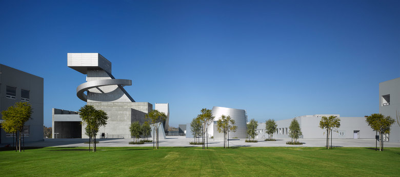 Material and colour concept – The materials and colours chosen for the project are an integral part of the architectural conception. The three sculptural forms - the tower, lobby and library - are clad in bead blasted stainless steel. Its softly reflective surface enhances the sculptural quality of the buildings and sets them apart from the rest of the campus. For acoustical reasons exposed concrete was chosen as the structural end exterior material of the theater. Its heaviness and the absence of openings create a powerful abstract form in whose hidden interior the space for special events can be found. The visual arts building – situated visibly along Grand Avenue – is clad elegantly in dark grey powder coated aluminum panels and accentuated through a façade of irregular round windows. The dance, music and administration buildings towards the back of the campus are clad in smooth grey plaster.