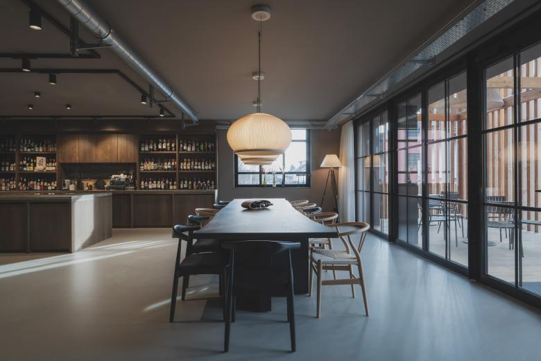 Im Zuge des Umbaus wurde im ehemaligen Lager ein modernes Büro geschaffen, das nicht nur Arbeitsplätze, sondern auch einen großzügigen Meetingraum und kreative Begegnungszonen bietet. Im vorderen Bereich befindet sich ein vielseitig nutzbarer Veranstaltungsraum, der sowohl als Empfangsbereich als auch als Eventlocation für Verkostungen und Weinproben genutzt werden kann. Ein großer Tisch bietet Platz für eine hohe Anzahl von Gästen und verleiht dem Raum eine einladende Atmosphäre.