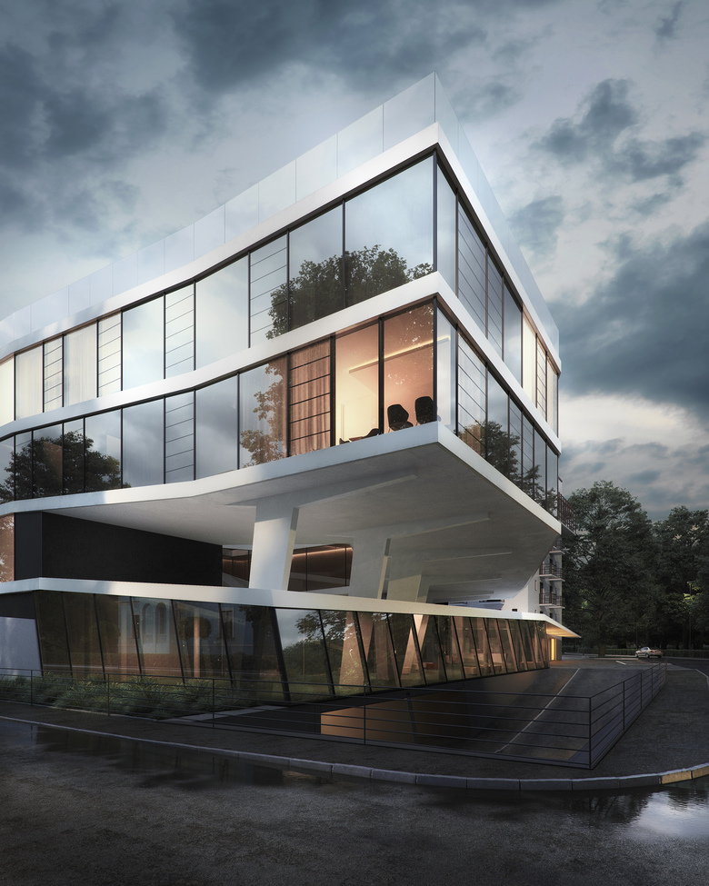 Die eigenständige Form des Neubaus, der relative Abstand, lassen eine Konkurrenz mit dem Altbau erst gar nicht entstehen. Die Solitäre stehen für sich autonom und sind nur im Erdgeschoss über eine gemeinsame Lobby verbunden.