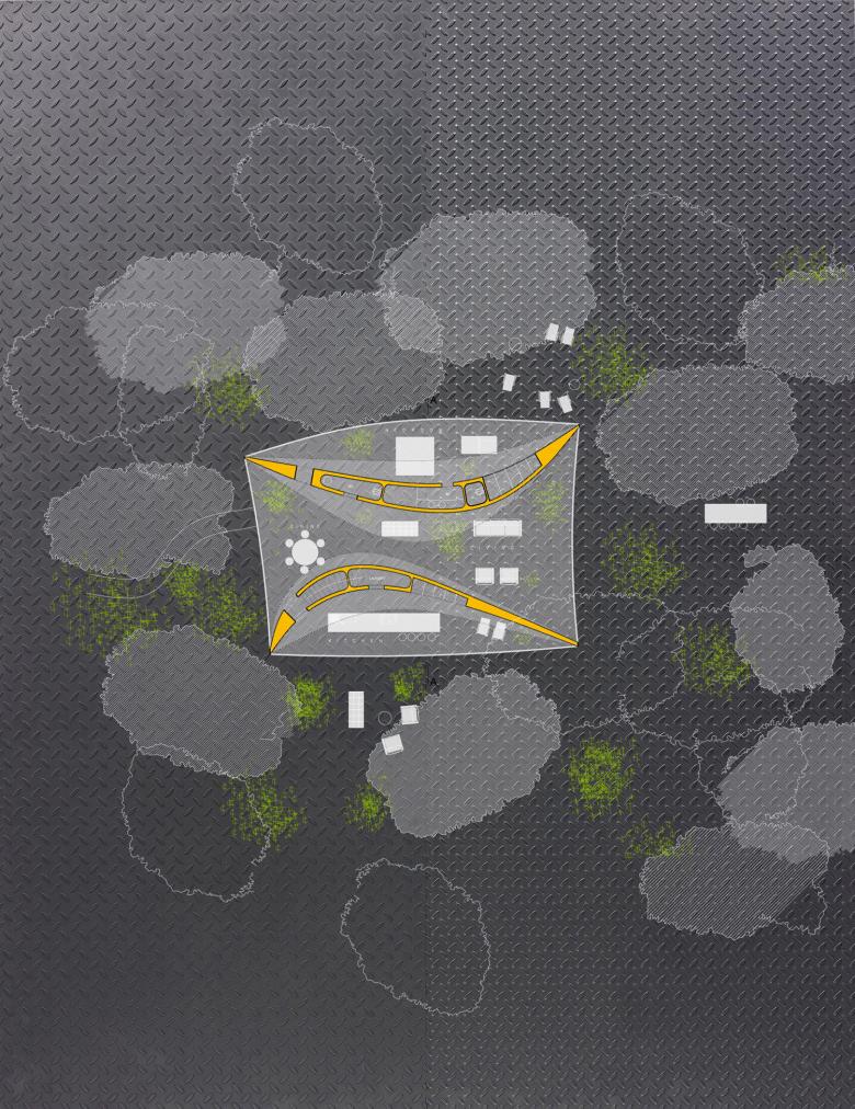 The new scale (the trees scale) and the pressurizing of the curves create a new relationship between nature and architecture.