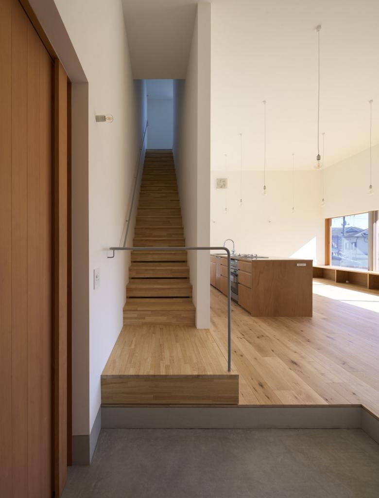 大開口からは広大な庭が望め、そこへ向かって長い桟橋が突き出し、内部空間と外部環境を視覚的につなぐ。一直線に伸びる階段は2階へと導き、2階の廊下は西側の竹林と東側の隣地の竹庭を切り取るように眺望を提供している。