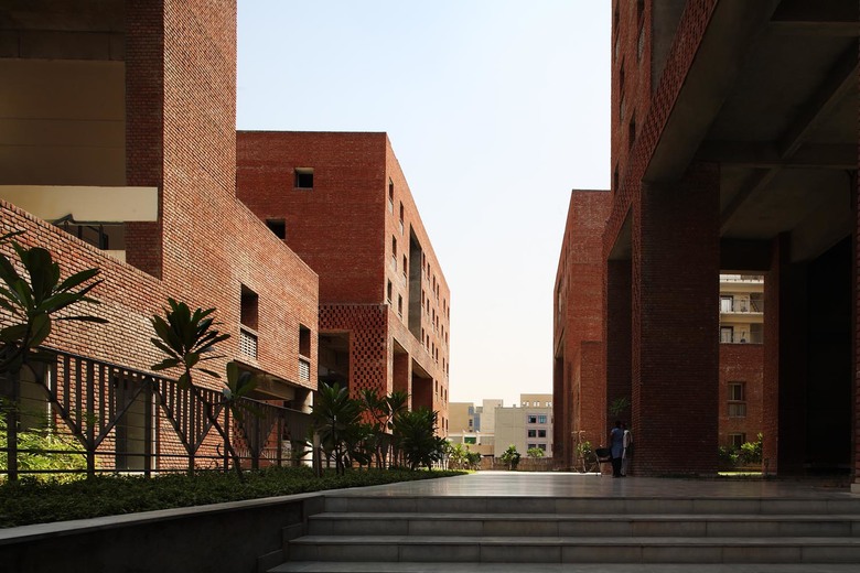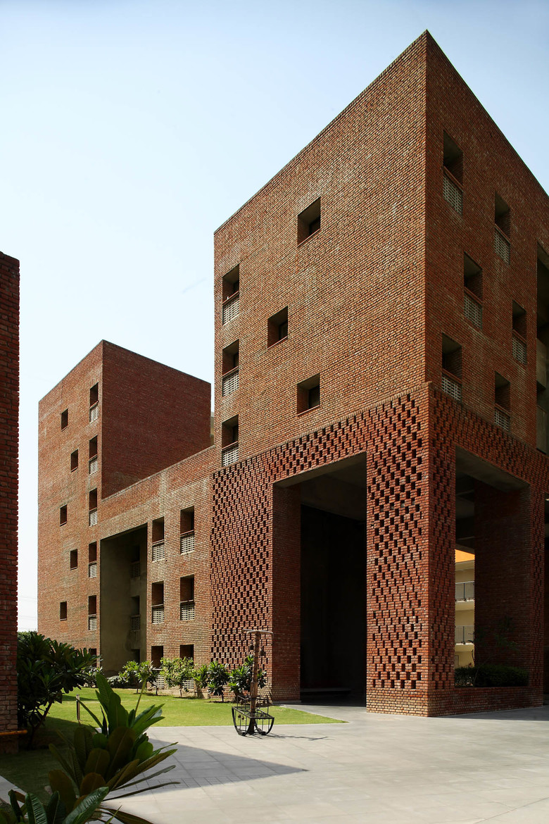 External conditions for most of the year make open spaces inhabitable; hence there is a great need for modifying the microclimate. A comprehensive environmental strategy is adopted to ensure the protection of the building from extreme climatic conditions. A compact built form that reduces heat gain is maintained taking care that optimum daylight and cross-ventilation in all the units are maintained. Deep recessed windows are provided for shading and help in controlling optimum day lighting. The facades are designed as the interface between the interior conditioned space and the outside environment and act as insulators and light filters to control and modulate inside conditions. The use of brick, brick jaalis and other simple finishes helps to maintain a simplistic material palette. The courtyards generate a micro-climate through water bodies and shading. All materials are sourced from within 500km of the site.