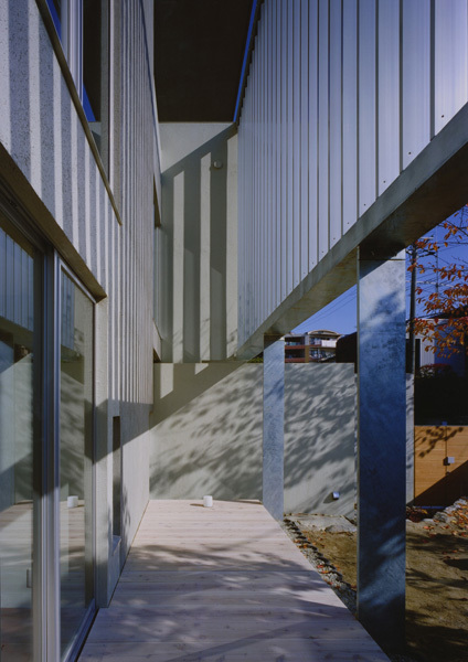 2世帯住宅。住み手の記憶を継承するように庭の桜の木を残しながらの建て替え計画。アルミルーバーは外部との間に中間領域をもたらし、ファサードに多様な表情をもたらす。