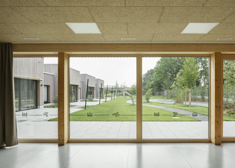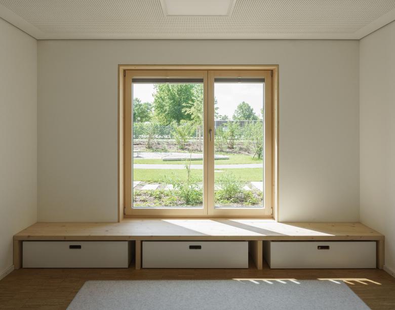 Der winkelförmigen Neubau des viergruppigen Kindergartens schirmt den Freispielbereich zur vorhanden sowie zur geplanten Wohnbebauung hin ab. Im zweigeschossigen Kopfbau befinden sich neben dem Zugang alle gemeinsam ge- nutzten Räume im Erdgeschoss sowie zusätzlich Wohnungen für Erziehungspersonal im Oberge- schoss. Schon im zentralen Foyer bietet sich hier ein direkter Durchgang zum Garten und mittels der mobilen Faltwand kann der Mehrzweckraum zugeschalten und so Platz für gemeinsame Feste und Veranstaltungen geschaffen werden. Die höher abgesetzten Baukörper für die Gruppenräu- me gliedern und rhythmisieren den erdgeschossi- gen Bauteil und durch die Raumnischen mit den Garderobenbereichen entstehen Durchblicke und Aufweitungen des Spielflurs zur Nordseite hin. An der Stirnseite des Kopfbaus erschließen sich die vier Apartments über eine einläufige Treppe und den Laubengang. Die Ausrichtung der Wohnungen erfolgt zur Westseite, um eine maximale Privatheit und einen Rückzug zum Alltag zu ermöglichen.