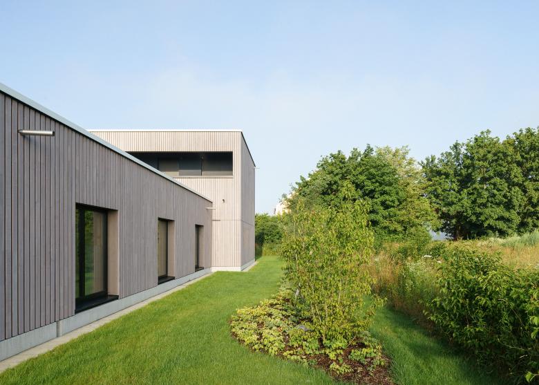 Bei den Volumen der Gruppenräume variiert die vorvergraute Holzverschalung in der Fugenaus- bildung und die Gebäudeeinschnitte im Oberge- schoss sind einheitlich mit den Fensterflächen als dunkel abgesetzte Bänder gestaltet.