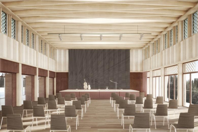 Der Projektvorschlag gründet auf der Idee eines einladenden Kirchgemeindezentrums mit offenen Türen für alle. Die Kirchgemeinde verbindet als Gastgeberin die Dorfteile, Aussengegenden, Generationen, Kulturen, Altersgruppen und Lebenswelten. Das Freiraumgefüge ordnet sich den vorgefundenen Qualitäten der heutigen Anlage mit der Kirche als kantonal geschütztes Kulturobjekt unter. Zwischen der Kirche und dem Eingang des Kirchgemeindezentrums wird ein ellipsenförmiger Freiraum angelegt und mit fünf Kirschbäumen bepflanzt. Der fein