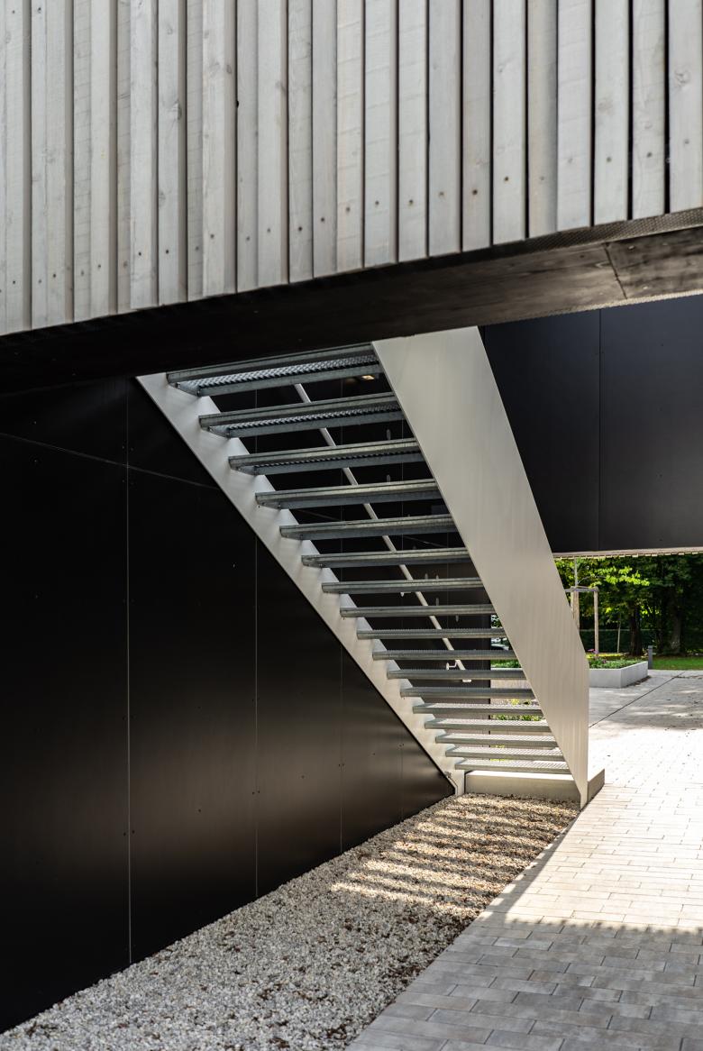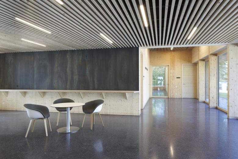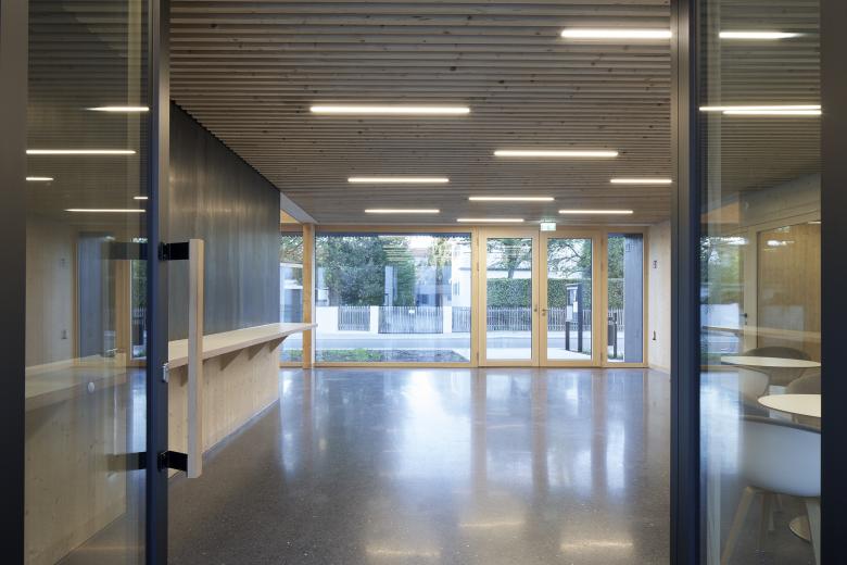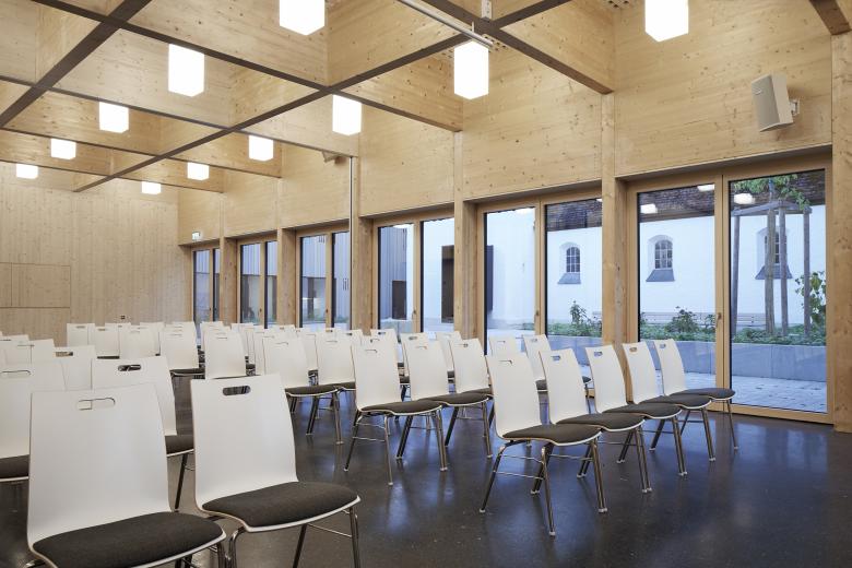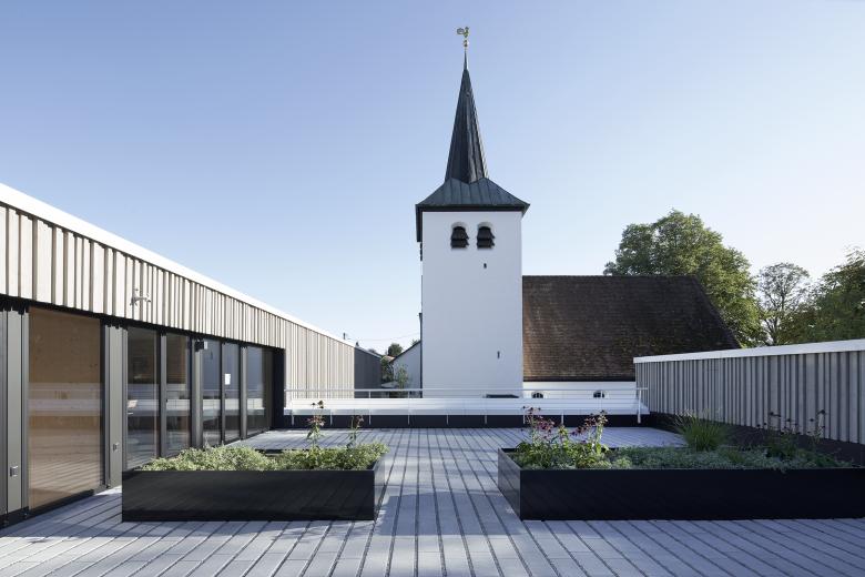 Bei der Heilandskirche in Unterhaching ist ein neues, evangelischen Gemeindezentrum für vorab auf mehrere Standorte im Ort verteilte Funktionen entstanden. Neben den beiden Veranstaltungssälen wurden weitere Räume für die Kirchengemeinde und für die Jugend geschaffen. Das Pfarramt sowie die Pfarrwohnung sind in den Neubau ebenso integriert wie zusätzliche Wohnungen für Besucher. Das neue Gebäude nimmt sich zurück, ordnet sich mit seiner Bescheidenheit der Kirche unter und reagiert sensibel auf den vorhandenen Baumbestand. Zum Kirchvorplatz an der Robert-Koch-Straße öffnet sich der Innenhof, der auch alle Besucher zum Betreten, Begegnen und zum Austausch einlädt. Der Hauptzugang ins zentrale Foyer ist von hier sowie von der Liebigstraße aus möglich. Zur benachbarten Wohnbebauung mit deren privaten Gärten schafft die zweigeschossige Bebauung dann an der Ostseite einen baukörperlichen Abschluss mit einer bewußten Fuge zur Kirche. Die sägerauen Holzfassaden außen spielen durch ihre unterschiedlichen Tiefen mit Licht und Schatten und stehen im Kontrast zu den natürlichen, glatten Oberflächen der Holzkonstruktion im Innenbereich.