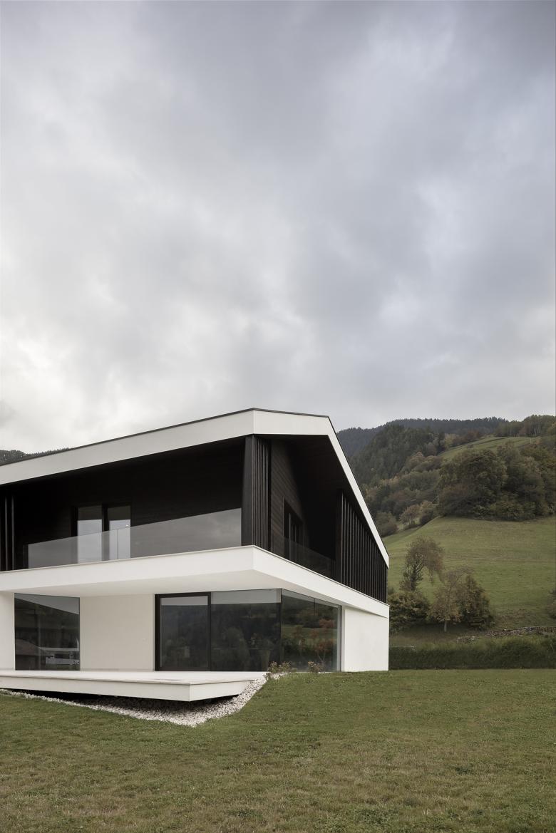 The two-storey house is located in the municipality of Laion, which marks the entrance to the Val Gardena in South Tyrol. The design is typologically based on a traditional alpine home, consisting of a masoned ground floor, wooden upper floor and gabled roof, but reinterprets this by a reduction of the design language and the use of contemporary materials.