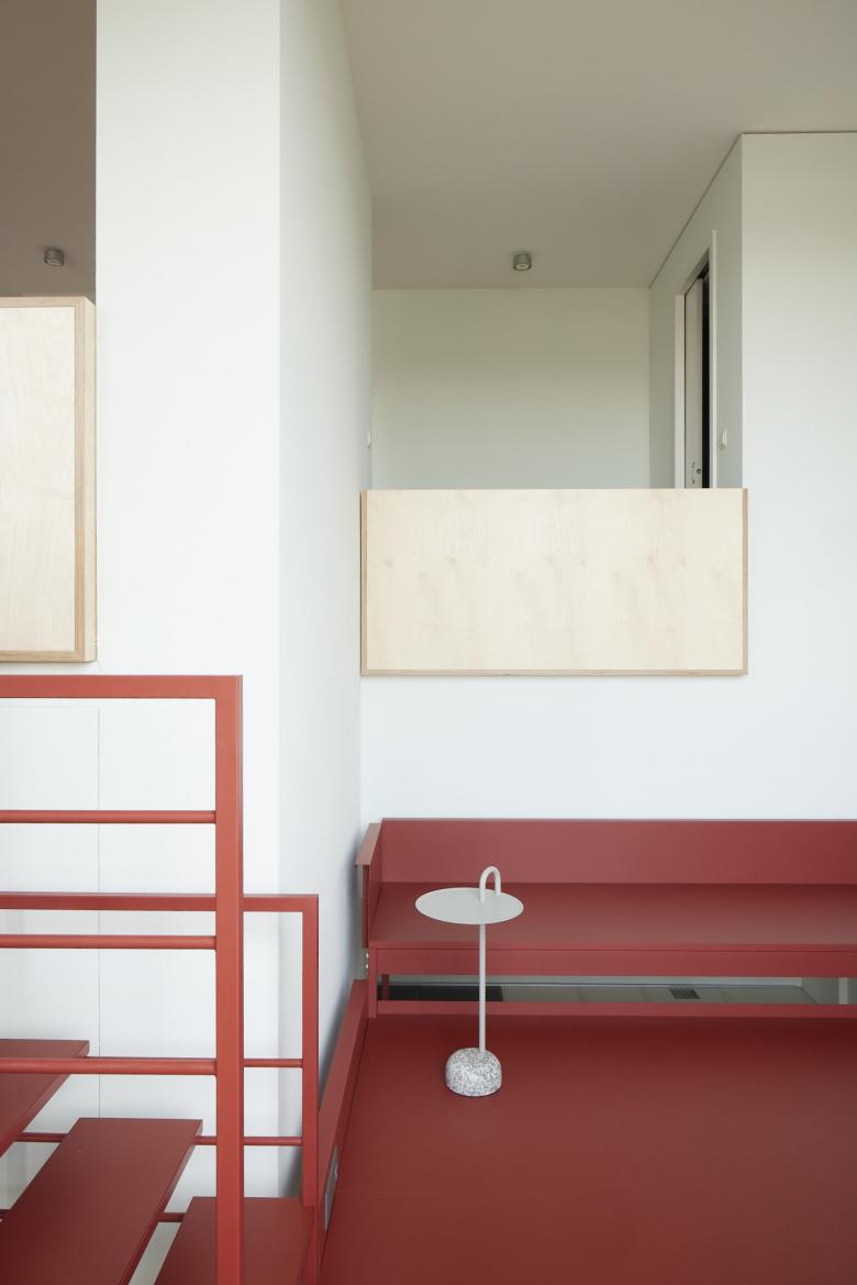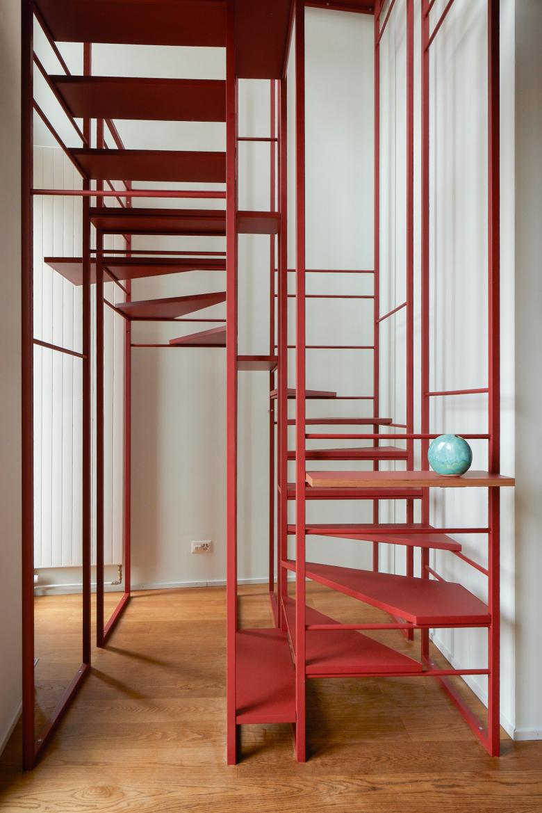 La ordenación de estos tres elementos crea un contraste equilibrado con lo preexistente, sin añadir peso visual ni ruido innecesario. Su carácter ligero y alámbrico permite el paso de luz, creando nuevas perspectivas y proyectando sombras sobre las paredes. Se establece así una interesante dualidad entre contraste y ligereza: el metal en tono rojo destaca frente al entorno, pero al mismo tiempo parece flotar en el espacio.