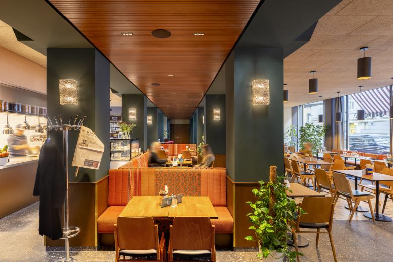 Das alles bei Rücksichtnahme auf die besondere Geschichte des Ortes. Ein Prinzip, dem auch BWM Architekten bei ihrer Arbeit folgten. Weitgehend erhalten wollte man den Stil des Hauses aus den frühen 1960er Jahren, diese gleichermaßen zurückhaltende wie elegante Architektur der damaligen Zeit. So wurde etwa im Eingangsbereich der schwarz-grüne Steinboden bewahrt, dazu ein geschwungenes Empfangspult, das nun Teil der neuen Bar ist, sowie einige Möbel im Vintage-Stil. Und auch der schöne alte Lift landet, wenngleich saniert, so doch visuell unverändert im Foyer.