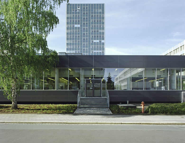 Der „Glaspalast“ markierte zu seiner Entstehungszeit (1959 – 1962) einen Meilenstein der Baukultur der Siemens-Schuckertwerke in Erlangen. Vom Hausarchitekten Hans Maurer als Bürogebäude mit Mitarbeiterrestaurant entworfen war es bei seiner Fertigstellung mit 60 Metern Höhe das höchste Bürohochhaus Bayerns. Auf einem Sockelgeschoss mit sandwichartiger Bänderfassade aus vorgehängten Travertin-Tafeln für Attika und Brüstung im Wechselspiel mit einem allseitig umlaufenden Aluminium-Fensterelemente-Band erhebt sich an der Südspitze punktartig die 25 Meter schmale Hochhausscheibe als Stahlbeton-Skelettbau mit einer filigranen Alu-Glas-Vorhangfassade.