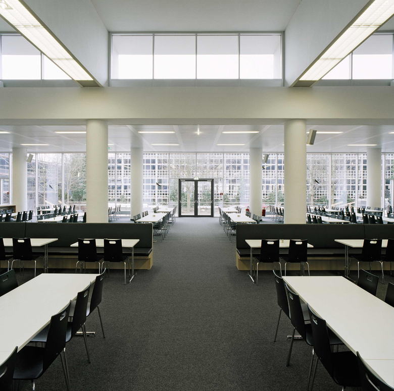 Unter Wahrung der prägenden großzügigen Raumarchitektur (Produktionsküche mit hohem Fensterband zum Straßenraum / zweiseitig belichteter Speisesaal mit Laternengeschoss) wurde die gesamte Baumaßnahme bei fortlaufendem Betrieb in vier Bauabschnitten realisiert.
