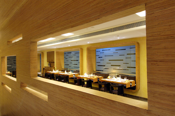 The other F & B outlet is LATITUDE, a multi-cuisine restaurant situated at the first floor. Long continuous wraps of stacked plywood float within this restaurant forming alcoves of varying scales juxtaposed against each other to create varying compositions of form as one moves through the restaurant and creating individual identities for the space within.