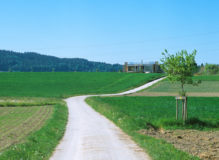 Das Grundstück liegt am südwestlichen Rand des Quartiers Langematt, schliesst süd- und westseitig an die Landwirtschaftszone an. Südlich begrenzt ein Flurweg, auf der Nordseite der lange Garagenbau des Nachbarhauses die Parzelle. Die Langematt ist ein Ein- und Zweifamilienhausquartier mit 1-, 2- und 3-geschossigen Gebäuden, unterschiedlichsten Dachformen und liegt westlich vom Zentrum Uettligen. Die bestehende Zufahrt erschliesst das Doppeleinfamilienhaus von der Nordseite her. Das Gebäude thematisiert die Besonderheit des Ortes an der Schnittstelle zwischen Landwirtschaftszone und gesichtslosem Wohnquartier, wird Abschluss des Quartiers zum offenen Land hin. Feingliedrig, ohne durch sein Volumen, sein Dach zu dominieren, lässt es den gebauten Nachbarhäusern Platz und Aussicht. Die hellen, lichtdurchfluteten Räume sind klar strukturiert und bieten zusammen mit den Aussenräumen ein abwechslungsreiches Wohnangebot. Das relativ offene Sockelgeschoss mit dem Kern kontrastiert mit der eher geschlossenen Nutzung des Obergeschosses. Die von aussen erschlossene Dachterrasse gibt den Blick in die verschiedenen Landschaftskammern frei. Alle verwendeten Materialien sind natürlich und erfüllen nachhaltige Kriterien.