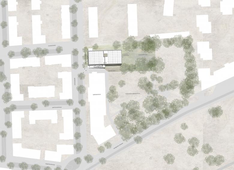 Der Entwurf für den Neubau der Kindertageseinrichtung formuliert hier einen klaren, unaufgeregten, rechteckigen Baukörper entlang der nördlichen Bauflucht. Die vorhandene Topographie nutzend wird das Gebäude als Splitt-Level-Haus geplant. Dies bietet für den Nutzer den Vorteil kürzerer Wege und besserer Sichtverbindungen zwischen den einzelnen Ebenen. Städtebaulich betrachtet wird der Neubau durch seinen Höhenversatz in seiner Längenabwicklung gegliedert.